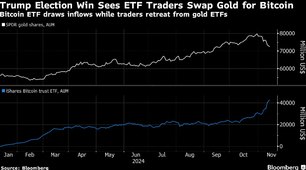 由于人们预期特朗普的政策将提振数字资产,加密货币自美国大选日以来也一路飙升。贝莱德的现货比特币ETF——iShares Bitcoin Trust ETF的总资产规模在上周已首次突破了400亿美元。在比特币ETF资产规模激增的同时,全球最大的实物黄金ETF——SPDR Gold Share则出现了大幅流出。