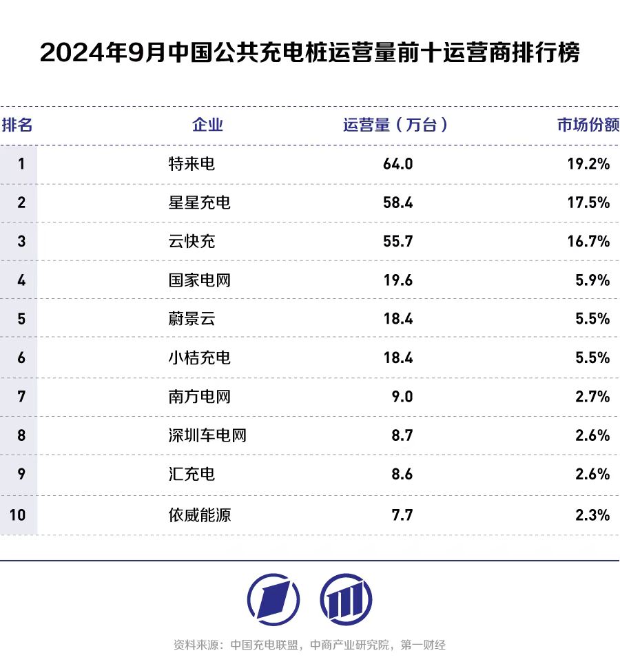 根据中国充电联盟9月数据,运营商前三强分别为特来电、星星充电和云快充,三家市场份额总计达到53.4%。其中,特来电运营有64万台公共充电桩,占据近20%的市场份额。