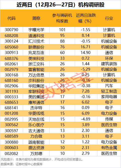 近两日(12月26日—27日)共有50股获机构调研,其中,23股获10家及以上机构扎堆调研。