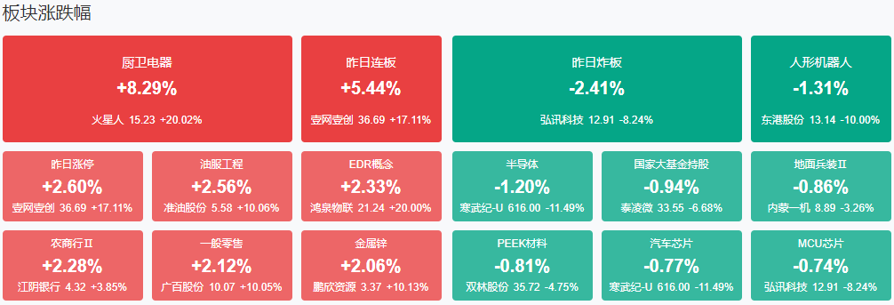 板块方面,家用电器、油气、有色金属、小红书概念等板块涨幅居前,人形机器人、半导体、军工、白酒等板块跌幅居前。截至收盘,沪指涨0.21%,深成指涨0.06%,创业板指涨0.01%。