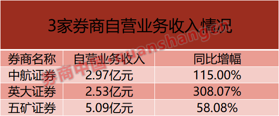 从3家已经发布详细财报券商来看,自营业务收入成为拉动业绩的主要推动力,个别券商自营业务收入增幅惊人直接推动业绩大幅增长。
