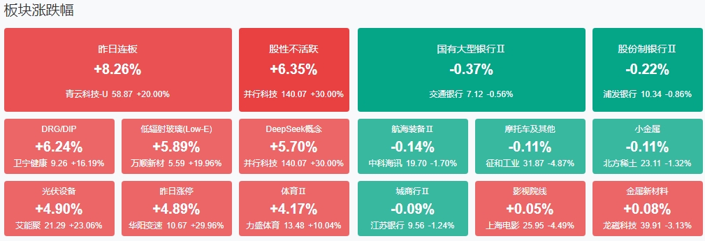 行业板块几乎全线上扬,光伏设备、软件开发、医疗服务、多元金融、汽车整车、汽车服务、钢铁行业、证券、互联网服务板块涨幅居前,仅银行板块逆市翻绿。