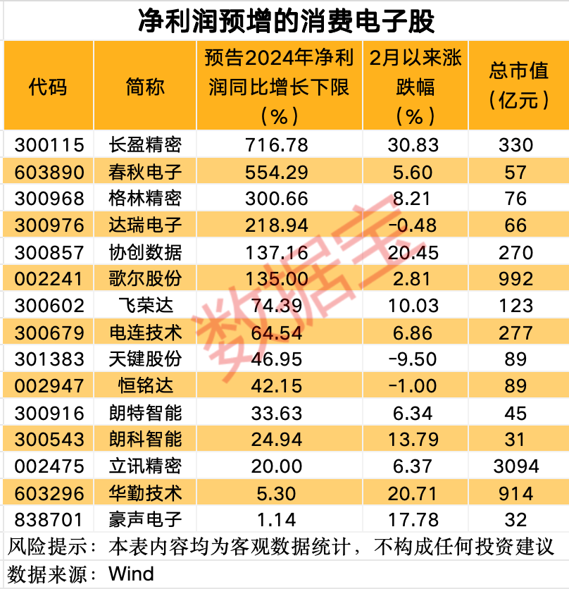 长盈精密业绩预告显示,预计实现归母净利润7亿元至8.2亿元,同比增长716.78%至856.79%,预计增幅在消费电子股中居首,公司表示,消费类电子及新能源市场持续复苏向好,公司营业收入、归母净利润均有望创下历史新高。