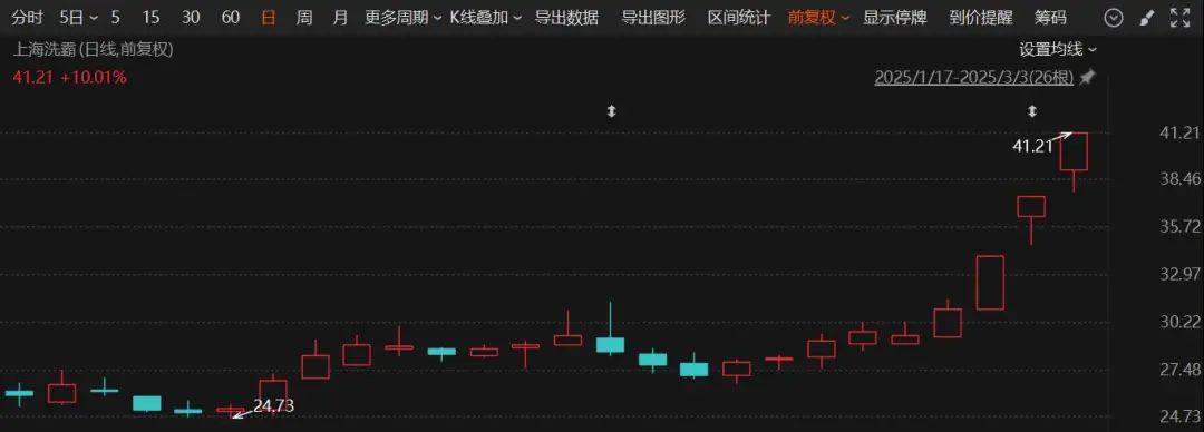 2025年2月27日、2月28日、3月3日连续三个交易日内,上海洗霸累计涨幅偏离值超过30%,2025年2月26日至2025年3月3日上海洗霸股票交易价格涨幅累计达39.88%。