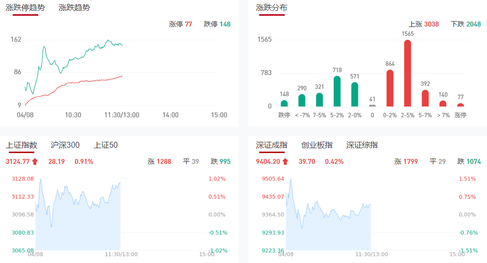 市场早盘展开反弹,创业指领涨。沪深两市半日成交额1.03万亿,较上个交易日缩量449亿。盘面上市场热点主要集中在农业、消费等方向,个股涨多跌少,全市场超3200只个股上涨。从板块来看,农业股持续大涨,北大荒等10余股涨停。大消费股震荡反弹,零售方向领涨,永辉超市等多股涨停。中字头、基建股一度冲高,中国中车接近涨停。下跌方面,苹果概念股延续跌势,歌尔股份等多股连续3个交易日跌停。