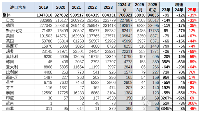 根据崔东树在文中列举的数据,2025年1-3月进口车最高的是日本30517辆、德国23695辆、斯洛伐克17733辆、美国8871辆、英国8371辆、墨西哥1443辆、瑞典1371辆、奥地利695辆、韩国359辆、意大利266辆。1-3月同比去年1-3月增量最大的是斯洛伐克1931辆、比利时98辆、波兰85辆、越南40辆、西班牙23辆。
