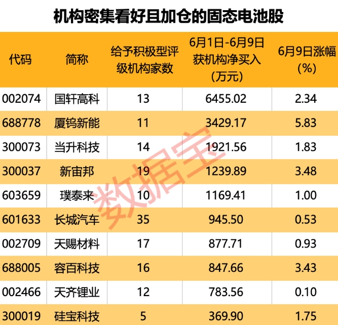 在Wind固态电池指数成份股公司中,6月1日—6月9日获机构净买入且获5家及以上机构给予积极型评级(含“买入”和“增持”评级)的个股有10只,其中国轩高科、厦钨新能获机构净买入超3000万元。
