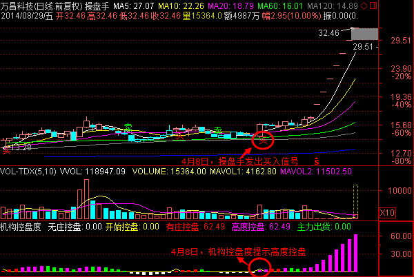 该股在4月8日《富赢版V6》操盘手指标发出买入信号,4月8日机构控盘度指标提示高度控盘,股价震荡上扬,按照软件提示买入的用户,可以继续持股,没有按照软件发出的买入信号介入的软件用户,建议不宜追涨。