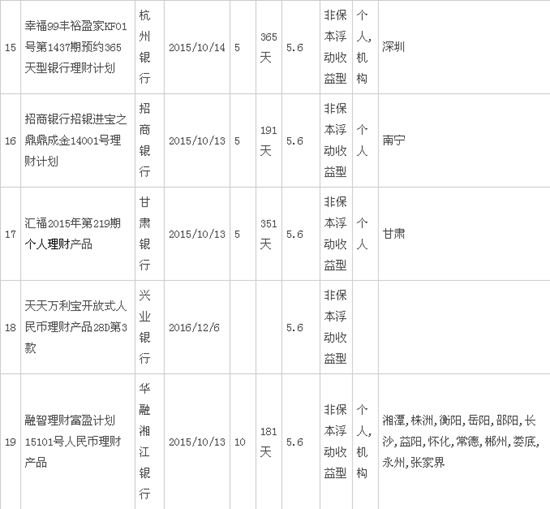 2015年10月10日在售高收益银行理财产品:今日在售预期年化收益率在6%以上的银行理财产品7款。汉口银行发行的“九通理财智债15001期理财产品”预期收益率最高,为7%。