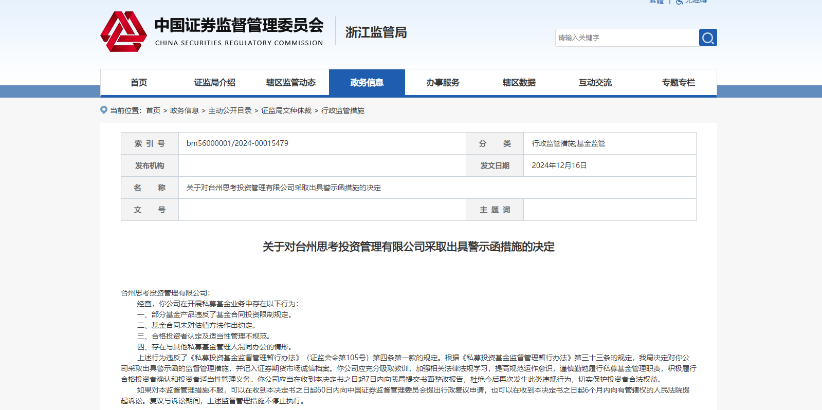 12月16日,知名私募机构浙江思考私募基金股份有限公司被浙江证监局出具警示函。公司在开展私募基金业务中存在以下行为,首先是未按基金合同约定履行关联交易有关程序,未按基金合同约定向投资者披露关联交易等信息;其次是部分基金产品违反了基金合同投资限制规定;第三是未及时更新基金业协会信息披露备份系统中投资者信息。