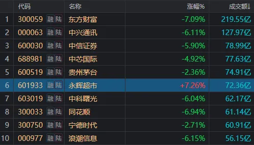 早间黄线上穿白线,主要得益于以零售板块为代表的大消费走强。中百集团高开高走,快速走出6连板。龙头股永辉超市一度涨停,收盘时也是成交额TOP10中唯一收涨个股。