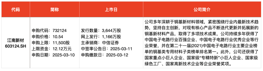 据澎湃新闻根据公开信息梳理统计,本周(3月10日-3月14日),5只新股安排网上申购。申购的新股为江西江南新材料科技股份有限公司(简称“江南新材”,603124.SH)、矽电半导体设备(深圳)股份有限公司(简称“矽电股份”,301629.SZ)、广东新亚光电缆股份有限公司(简称“新亚电缆”,001382.SZ)、胜科纳米(苏州)股份有限公司(简称“胜科纳米”,688757.SH)、浙江华远汽车科技股份有限公司(简称“浙江华远”,301535.SZ)。