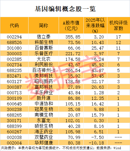 据证券时报·数据宝统计,截至3月27日收盘,基因编辑概念股合计A股市值2075亿元。今年以来概念股平均上涨14.49%,跑赢同期上证指数。6股累计涨幅超20%,分别是美邦科技、利民股份、百济神州-U、昭衍新药、百普赛斯、富邦科技。以3月27日收盘价与2024年以来高点相比,4股回撤幅度超30%,分别是硕世生物、大北农、双鹭药业、南模生物。