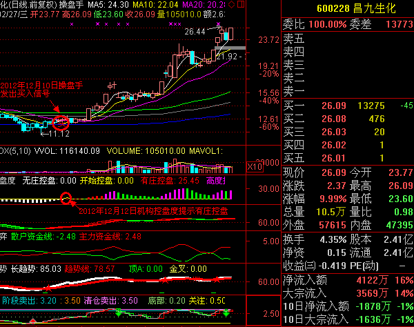 该股在2012年12月10日《操盘软件富赢版2012》操盘手指标发出买入信号,在2012年12月12日发出机构有庄控盘信号,随后股价大幅拉升,目前仍处高度控盘状态,截至2013年2月27日,区间涨幅达108%以上,软件至今尚未发出卖出信号提示,建议继续持股,注意量价关系,出现放巨量滞涨则建议逢高减仓或出局。