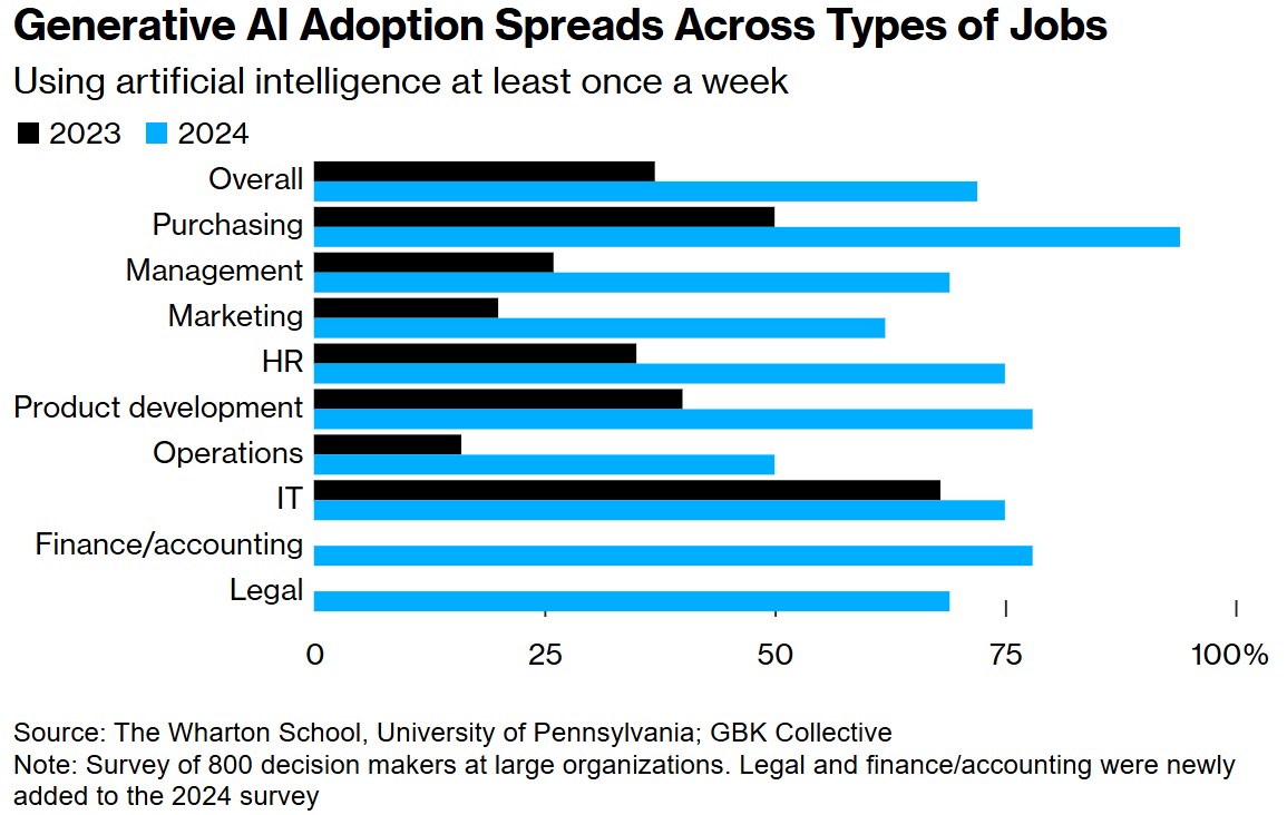 在去年起步缓慢的领域,包括人力资源、市场营销和运营,采用情况有所好转。在法律和金融领域(今年被纳入调查),每周使用的频率几乎和IT行业一样普遍。