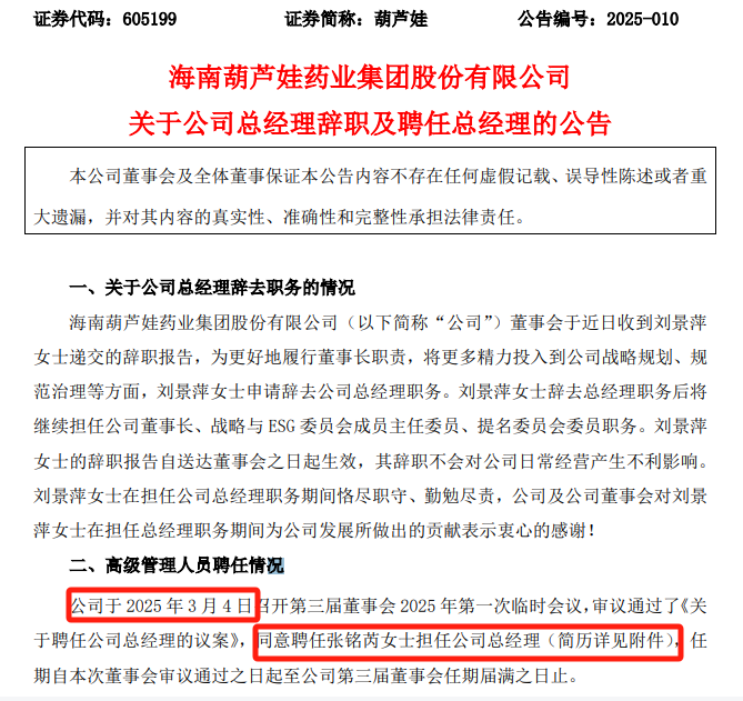 张铭芮任职葫芦娃总经理不足两个月。3月4日,葫芦娃董事会审议通过议案,同意聘任张铭芮为公司总经理,任期自公司董事会审议通过之日起至第三届董事会任期届满之日止。