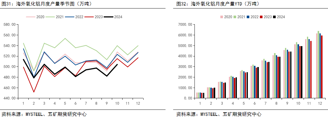 2024年海外地区前十个月累计氧化铝产量4940万吨,较去年同期同比下滑0.09%。上半年海外氧化铝产量较去年仍小幅增长,但随着澳洲美铝和力拓氧化铝厂相继停产,叠加印度氧化铝厂投产不及预期,导致整体氧化铝产量持续维持在近五年较低水平。