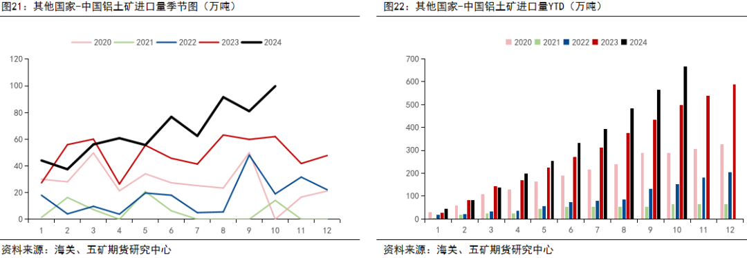 2024年前十个月中国累计进口澳大利亚铝土矿3300万吨,同比进口增加18.34%。4月以后,澳洲进口量持续维持在近五年最高水平,主因是澳洲美铝和力拓氧化铝厂减产有部分铝土矿过剩增量。随着力拓氧化铝冶炼厂的逐步复产,明年澳洲铝土矿进口量或小幅下降。
