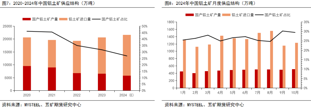 2024年前十个月中国铝土矿产量合计达4802.3万吨,同比下滑14.61%,产量处于近五年最低水平。随着矿山手续的批复,国产矿逐步复产,但整体增量有限,预计2025年国产矿仍难见大幅复产。