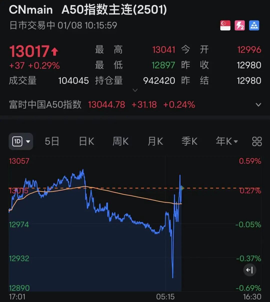 不过,值得注意的是,此前一度低开的富时中国A50指数期货,直线拉升翻红。