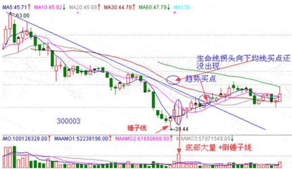 底部倒锤子线。低价区的倒锤子线往往被看成股价见底的较强烈信 号。如果倒锤子线和下影线下穿原有的低位线,则这种信号更加可靠。底价区 出现倒锤子线,表明空方的压力已式微,虽然空方一度仍占上风,但由于低位 的多方承接盘有力,空方最终败下阵来。乐于抄底的投资者可以将倒锤子线视 为试探性和建仓信号,但稳健的投资者还应观察。