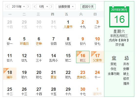 2018年端午放假安排:2018年6月16日至6月18日放假,共3天
